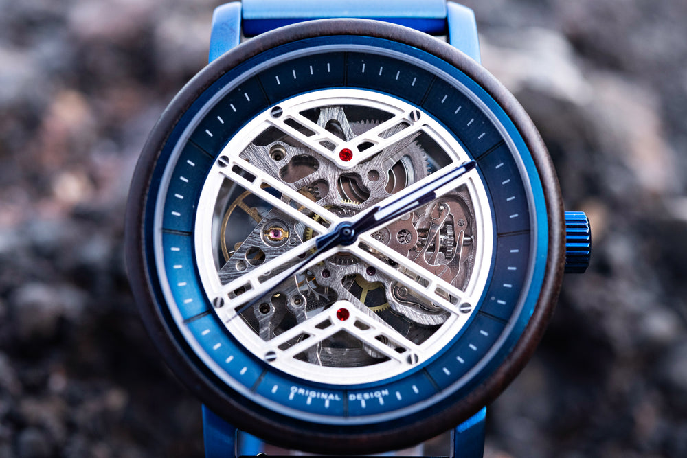 Met een opvallend samenspel van blauwe, zwarte en zilveren accenten is dit automatische horloge een viering van modern design en uitzonderlijk vakmanschap. Het betoverende 'X'-detail in het hart van het ontwerp symboliseert verbinding en balans, en creëert een horloge dat zowel betekenisvol als adembenemend is.